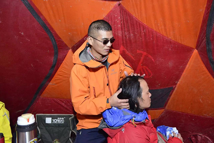 在海拔5500米處的雪線位置,教練們,選擇了一處較為平緩的雪坡,作為大本營,在這裡對隊員們進行登頂前的指導訓練。指導隊員們使用上升器與下降器,體驗穿着高山靴帶着冰爪走路的感覺,教練們在這裡認真介紹技術要領,并耐心解答隊員們提出的各種問題。休息之餘大家都躲在帳篷裡,有說有笑,完全消除了屋外雪山的寒冷。有從内地來的隊友,因高原反應,頭疼難忍,張洪就幫他們一一按摩推拿,緩解疼痛,大家就像一家人,其樂融融。
